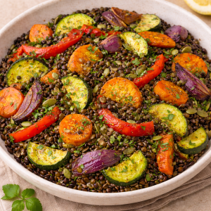 Este almuerzo combina legumbres de alta calidad nutricional con verduras asadas ricas en antioxidantes y una vinagreta ligera con efecto antiinflamatorio. Las lentejas beluga aportan proteína vegetal y hierro, mientras que el horneado suave de las verduras potencia el sabor sin necesidad de frituras. Un plato completo, equilibrado y muy reconfortante.